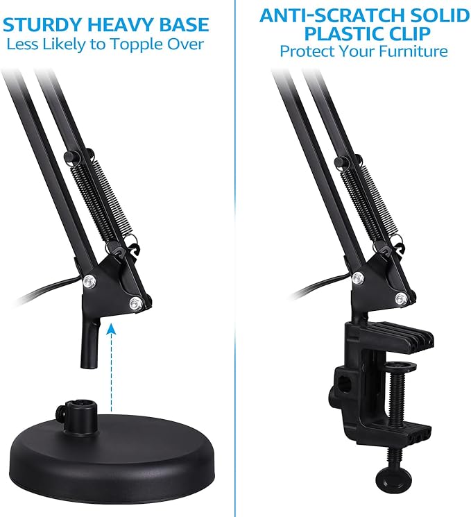 Calitate premium – Braț și abajur din metal solid cu finisaj elegant negru; baza grea oferă stabilitate. Conectorul de alimentare UL-listed garantează siguranță la utilizare.